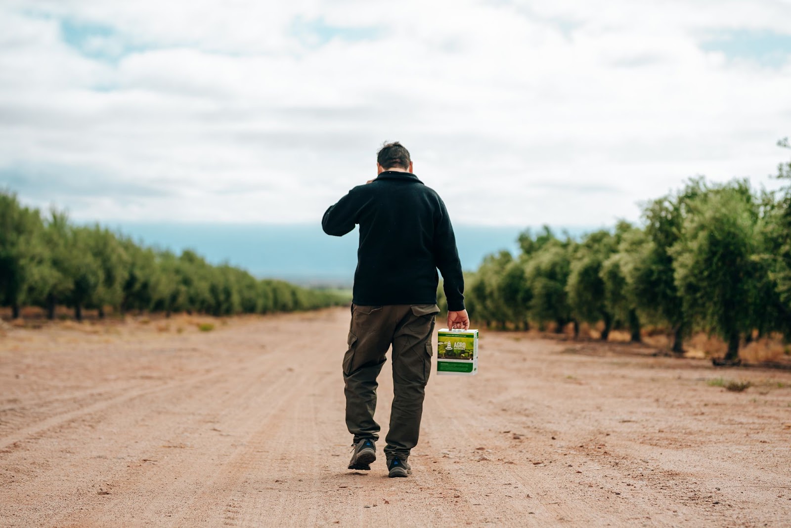 Productor regional de Agro Sustentable sostiene una caja de bioinsumo BIOFERT GTG durante una entrevista sobre agricultura orgánica.